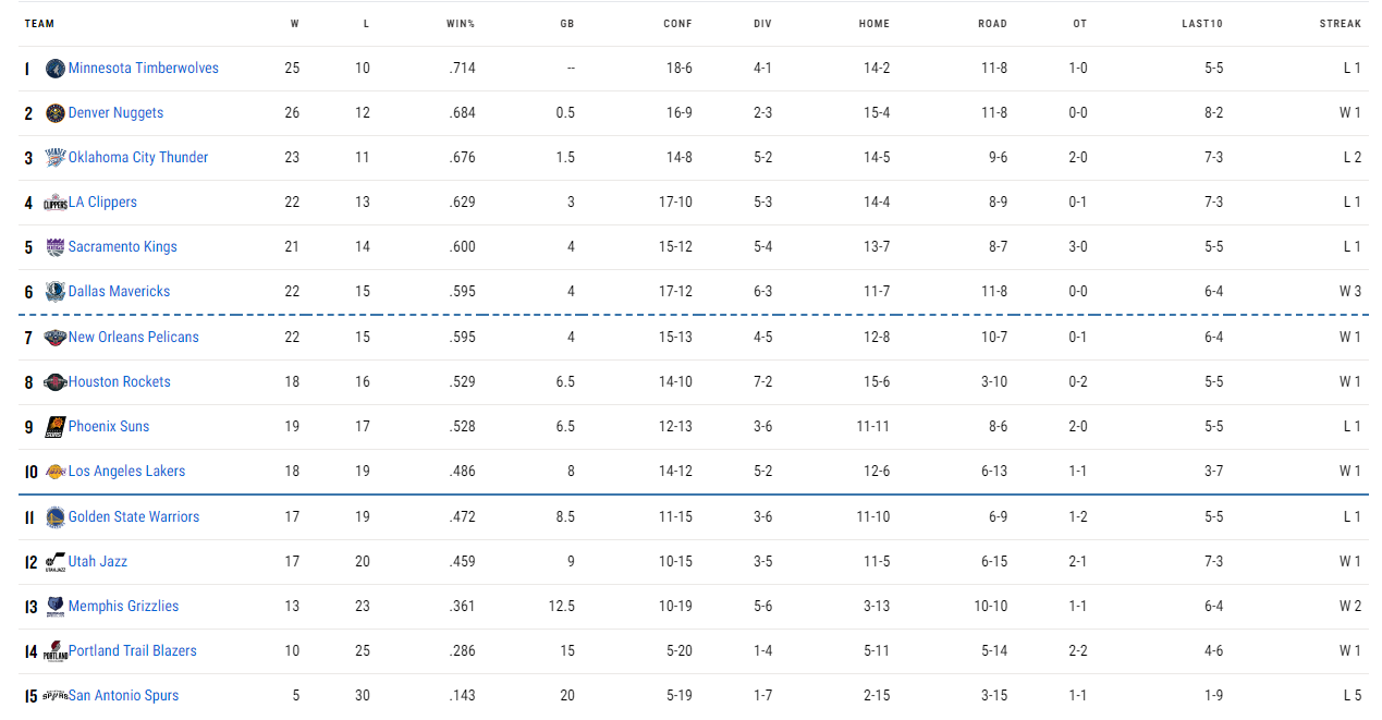 La Conferencia Oeste vuelve a ser, un año más, la conferencia más competida de la NBA. Si bien Timberwolves y Nuggets tienen algo de diferencia con respecto al resto de equipos, del 3º al 7º clasificado solo hay un triunfo de diferencia y la lucha por el play-in también está siendo muy competida con un único triunfo de diferencia entre los Rockets (8º) y los Jazz (12º). Y todo esto sin haber alcanzado todavía el ecuador de la temporada.